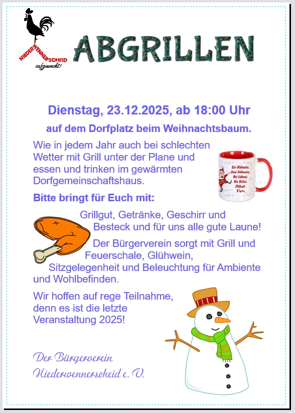 Am 04. Dezember 2025 findet das nächste Bürgervereinstreffen bei Sabine und Klaus Schultes, Grasweg 9 (Schweizer Stub’n), statt. Anzahl Personen auf 18 begrenzt. -