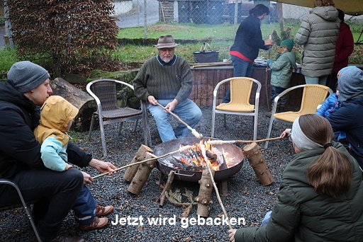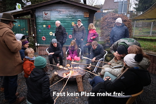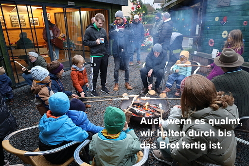 In der Feuerschale prasselte schon das Feuer, um genügend Glut zu erzeugen. Die sollte natürlich zum Gelingen der Überraschung für die Kinder (auch die Großen) beitragen. Das Dorfhaus war aufgeheizt und Ulrike mit ihrer Gitarre sang mit den Kindern die bekannten Weihnachtslieder wie „O Tannenbaum“, „Schneeflöckchen, Weißröcken“ .