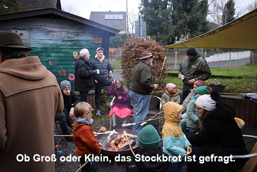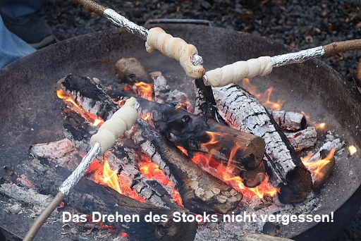Um 16:00 Uhr kam die Überraschung, nämlich Claudia und Klaus mit dem Stockbrotteig, denn dafür brauchten wir die Glut. Bald saßen viele Kinder um die Feuerschale herum und buken den am langen Stock aufgewickelten Brotteig. Ständiges Aufpassen und Drehen war angesagt, damit der Teig nicht verbrannte. Und der schmeckte dann!