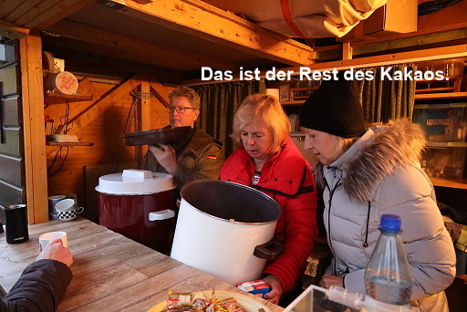 Zwischenzeitlich hatten Irene, Udo und Eva die Theke der „Alten Hütte“ in Betrieb genommen und bald dampfte es aus dem Glühwein- und dem Kakaokessel.