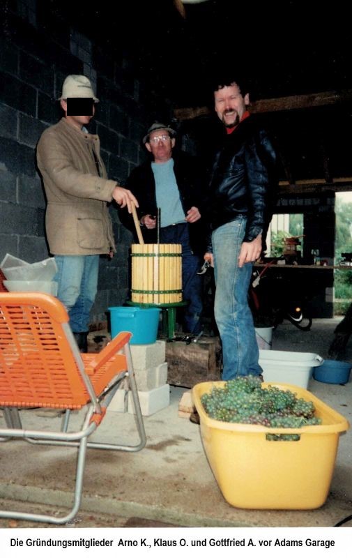 Das früheste dokumentierte Weinkeltern zeigen Klaus, Arno und Gottfried im Herbst 1989, bereits jedoch mit jener Ausrüstung, welche wir heute noch benutzen: