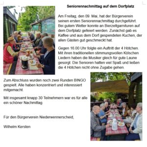 Der Bürgerverein Niederwennerscheid e. V. ist von der Gemeinde Neunkirchen-Seelscheid als förderwürdig im Rahmen von Seniorenarbeit anerkannt worden. Aus diesem Grund soll im Mai 2025 ein Seniorennachmittag durchgeführt werden.